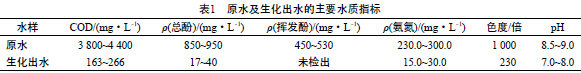 原水取自國內(nèi)某煤氣化廠酚氨回收后的煤氣化廢水。采用厭氧膨脹顆粒污泥床—好氧接觸氧化工藝處理原水,處理后的出水(簡稱生化出水)用于實(shí)驗(yàn),原水及生化出水的主要水質(zhì)指標(biāo)見表1。