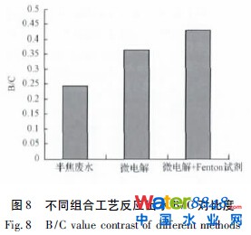 由圖8 可知,半焦廢水的B /C 為0. 24,屬于較難生化處理廢水,需要采用預(yù)處理工藝對(duì)其處理后提高其B /C 才能滿足生化處理要求。經(jīng)過微電解處理后半焦廢水B /C 由原水的0. 24 上升至0. 37,廢水可生化性得到顯著提高,達(dá)到可生化處理要求。通過進(jìn)一步采用微電解+ Fenton 試劑法處理后出水的B /C 可由原來的0. 24 提高到0. 43,滿足易生化處理要求,因此采用微電解+ Fenton 試劑法工藝預(yù)處理半焦廢水后出水的可生化更好,采用此組合工藝對(duì)處理半焦廢水是可行的。
