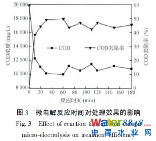 將50 mL 粒徑5~7 mm的鐵屑和50 mL 粒徑2~ 3 mm 的活性炭混合均勻后裝入反應(yīng)燒杯,引入pH 為8. 03 的半焦廢水,控制半焦廢水在燒杯中的停留時(shí)間,測(cè)定出水中COD 濃度,分析反應(yīng)時(shí)間對(duì)COD 處理效果的影響,結(jié)果見圖3。