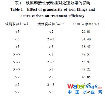 分別取50 mL 不同粒徑的鐵屑和50 mL 活性炭均勻混合裝入燒杯,引入pH 為8. 17 的半焦廢水,反應(yīng)120 min 后,測(cè)定出水中的COD 濃度,研究填料粒徑對(duì)COD 處理效果的影響,結(jié)果見表1。