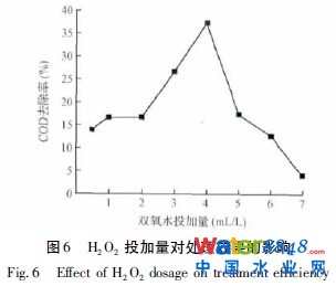 由圖6 可知,隨著H2O2用量的增加,COD 去除率先上升后下降。當(dāng)H2O2投加量小于4 mL /L 時(shí),COD 去除率隨H2O2用量的增加由13. 9% 升高到37. 27%,當(dāng)H2O2用量繼續(xù)增加,COD 去除率逐漸降低,當(dāng)H2O2投加量為7 mL /L 時(shí),去除率僅為3. 99%。原因主要是微電解出水中含有較多的Fe2 + ,添加的H2O2與Fe2 + 反應(yīng),產(chǎn)生氧化性極強(qiáng)的·OH,·OH 能氧化分解難降解有機(jī)污染物。隨著H2O2濃度的增加,·OH 量增加,有利于降解有機(jī)物,但是H2O2濃度過高時(shí),過量的H2O2不但不能通過分解產(chǎn)生更多的羥基自由基,反而在反應(yīng)一開始就把Fe2 + 迅速氧化成Fe3 + ,使反應(yīng)在Fe3 + 催化下進(jìn)行,如此既消耗H2O2,又抑制·OH 的產(chǎn)生。因此,實(shí)驗(yàn)確定H2O2最佳投加量為4 mL /L 左右。