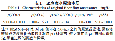 亞麻廢水原液取自云南大理某亞麻廠,其表觀呈棕黑色,色度(稀釋倍數(shù)法)>1 000 倍,pH 值4.30~4.50,有惡臭味,其水質(zhì)見表1。