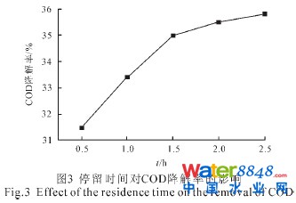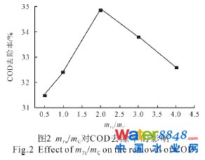 由圖2 確定mFe /mC=2:1 為最佳配比。此試驗(yàn)中廢水流經(jīng)鐵炭柱的過程可視為“動(dòng)態(tài)的微電解”過程,鐵炭的比值直接影響到形成微型原電池的數(shù)目[2,4-5],當(dāng)通入廢水后,在反應(yīng)器內(nèi)會(huì)形成無數(shù)的電位差高達(dá)1.2 V 的“原電池”。“原電池”以廢水做電解質(zhì),通過放電形成電流和新生態(tài)的[OH]、[O]、[H]、Fe2+、Fe3+等物種對廢水進(jìn)行電解氧化還原、絮凝吸附、絡(luò)合和電沉積等作用[2,6]。[OH]有很強(qiáng)的還原電位(Eθ=2.80Vvs NHE),導(dǎo)致其可以在常溫常壓下幾乎無選擇性地與廢水中有機(jī)物發(fā)生反應(yīng),結(jié)果能破壞有色廢水中的有色物質(zhì)的發(fā)色基團(tuán)或助色基團(tuán),甚至斷鏈,達(dá)到降解、脫色的作用。由圖2 可知,當(dāng)鐵炭質(zhì)量比小于2.0 時(shí),隨著鐵屑量的增加,鐵屑與活性炭產(chǎn)生原電池的數(shù)目就相應(yīng)增加,處理效果相應(yīng)提高;在鐵炭質(zhì)量比等于2.0 時(shí)達(dá)到最大值;當(dāng)鐵炭質(zhì)量比大于2.0 時(shí),鐵屑過多會(huì)導(dǎo)致微電解不充分,使部分鐵屑難以和廢水充分接觸。Fe 量過高,F(xiàn)e2+生成過快,使溶液中積存大量的Fe2+,大部分Fe2+又可能與[OH]、[O]發(fā)生反應(yīng),導(dǎo)致COD去除率反而降低。