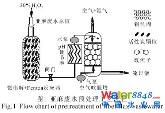 亞麻纖維制品在國際市場非常緊俏,是高檔的紡織制品。一方面,亞麻生產(chǎn)可以給人們帶來豐厚的經(jīng)濟(jì)收入,另一方面,由于該生產(chǎn)的廢水中含有高濃度、難降解有機(jī)污染物,如纖維素、半纖維素及其降解產(chǎn)物,木質(zhì)素及其降解產(chǎn)物,單寧、果膠、樹脂酸等,導(dǎo)致該廢水常呈棕黑色,有惡臭,化學(xué)耗氧量高且可生化性差,若將其直接排放會(huì)造成嚴(yán)重的環(huán)境污染。因而研究如何處理亞麻廢水以達(dá)回收再利用或達(dá)標(biāo)排放,實(shí)現(xiàn)綠色經(jīng)濟(jì)就顯得十分必要。目前對于亞麻廢水的處理,靠單一的方法很難達(dá)到預(yù)期目的,而傳統(tǒng)的處理工藝常采用幾種方法的有機(jī)組合[1],其中涉及生物處理的工藝要求被處理廢水可生化性要較好,廢水中有機(jī)物濃度不宜過高,但該工藝投資高且所耗時(shí)間比較長。
