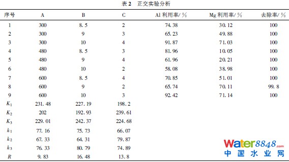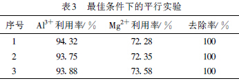 表1 為正交實(shí)驗(yàn)因素水平表, 表2 為正交實(shí)驗(yàn)的結(jié)果。由表2 可以顯示出不同條件對(duì)直接大紅染料的去除效果都非常好, 幾乎都在100 %, 因此可以通過(guò)分析Mg2+和Al3+的利用率來(lái)確定處理直接大紅染料廢水的最佳條件。根據(jù)極差分析可知, 各因素的影響程度順序?yàn)閜H 值>Mg/Al 摩爾比>初始濃度。最佳因素組合為A1B3C2。即最佳處理?xiàng)l件為染料初始質(zhì)量濃度300 mg/L, pH =10 ,Mg/Al 摩爾比3∶1。在最佳條件下進(jìn)行平行實(shí)驗(yàn), 結(jié)果見(jiàn)表3。在最佳條件下, 直接大紅染料的去除率可以維持在100 %,Mg2+和Al3+的利用率也可以穩(wěn)定維持在73 %和94 %左右, 具有較好的重復(fù)性, 在此條件下直接大紅染料廢水的凈化效果良好。