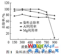 染料濃度對(duì)去除率的影響見(jiàn)圖1。如圖1 所示, 染料去除率隨著染料濃度的增加而減小。染料質(zhì)量濃度從150mg/L 增加到600mg/L 時(shí), 去除率沒(méi)有變化, 基本都維持在99 %以上。當(dāng)染料質(zhì)量濃度增加到780 mg/L 時(shí), 去除率就下降到了90.17 %。當(dāng)再加大濃度, 去除率就開(kāi)始驟然減小, 到900mg/L時(shí), 去除率僅剩5.8 %。而Mg2+和Al3+的利用率隨著染料濃度的增加逐漸降低。從圖1 可以看出, 染料質(zhì)量濃度在600 mg/L 以下時(shí)去除率可以達(dá)到很好的效果。