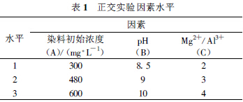 在以上單因素實(shí)驗(yàn)的基礎(chǔ)上, 本文選取了染料初始濃度、pH 值和Mg/Al 摩爾比作為正交實(shí)驗(yàn)的3個(gè)因素, 每個(gè)因素含3 個(gè)變化水平。采用L9(33)正交實(shí)驗(yàn)法進(jìn)行了實(shí)時(shí)合成LDH 去除直接大紅染料廢水條件的優(yōu)化研究。