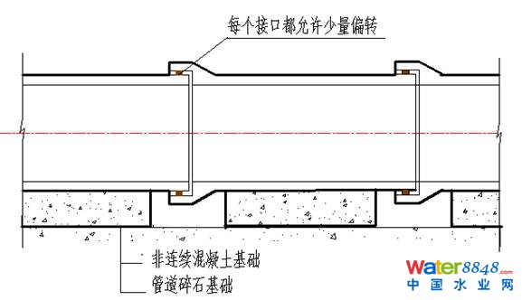 這種“凹”型基礎(chǔ),讓管身全部落在基礎(chǔ)上,承口限定在凹槽中(為接口嚴(yán)密創(chuàng)造了條件),管道和基礎(chǔ)成為“鏈條”,可以良好適應(yīng)允許的沉降變化