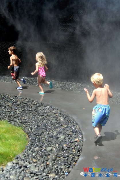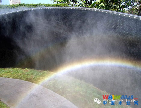 在酷熱的室外環(huán)境下,不只是天然植物能給人帶來(lái)清涼的感受,動(dòng)感景觀藝術(shù)家Ned Kahn通過(guò)他的創(chuàng)意水霧裝置有效降溫并增添更多的樂趣,可以讓孩子們即使三十多度的高溫下,也會(huì)在公園里東奔西跑,自由地鉆進(jìn)彩虹水霧,在清涼世界里享受人類設(shè)計(jì)和自然的奧妙。
