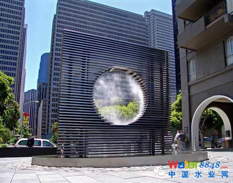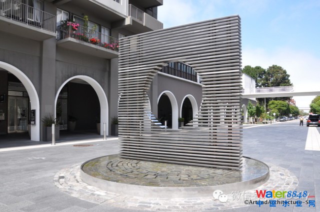 雕塑由多層水平的不銹鋼組成,霧從中央圓洞噴出。通過(guò)雕塑圓洞框景,透過(guò)層層薄霧,展現(xiàn)出城市新景觀。