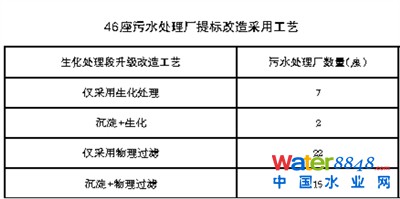 據(jù)了解,有相關(guān)機構(gòu)對全國46個污水處理廠的提標(biāo)改造情況進(jìn)行了統(tǒng)計研究,發(fā)現(xiàn)有些提標(biāo)改造項目僅采用生化處理工藝,有的采用沉淀+生化工藝,還有的采用物理過濾或者沉淀+物理過濾的升級改造技術(shù)。