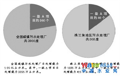 住建部城鎮(zhèn)污水處理廠的實時管理系統(tǒng)顯示,截至今年8月,全國城鎮(zhèn)污水處理廠共3900座,日處理能力1.55億立方米。其中,一級A項目約860個,日處理能力2925萬立方米。珠三角地區(qū)污水處理廠共308座,日處理能力1835萬立方米。其中,一級A項目約46個,日處理能力415萬立方米。“這些出水達(dá)到一級A的項目都是進(jìn)行過提標(biāo)改造的項目,但并不是出水全部都能達(dá)到一級A。”杭世珺說。
