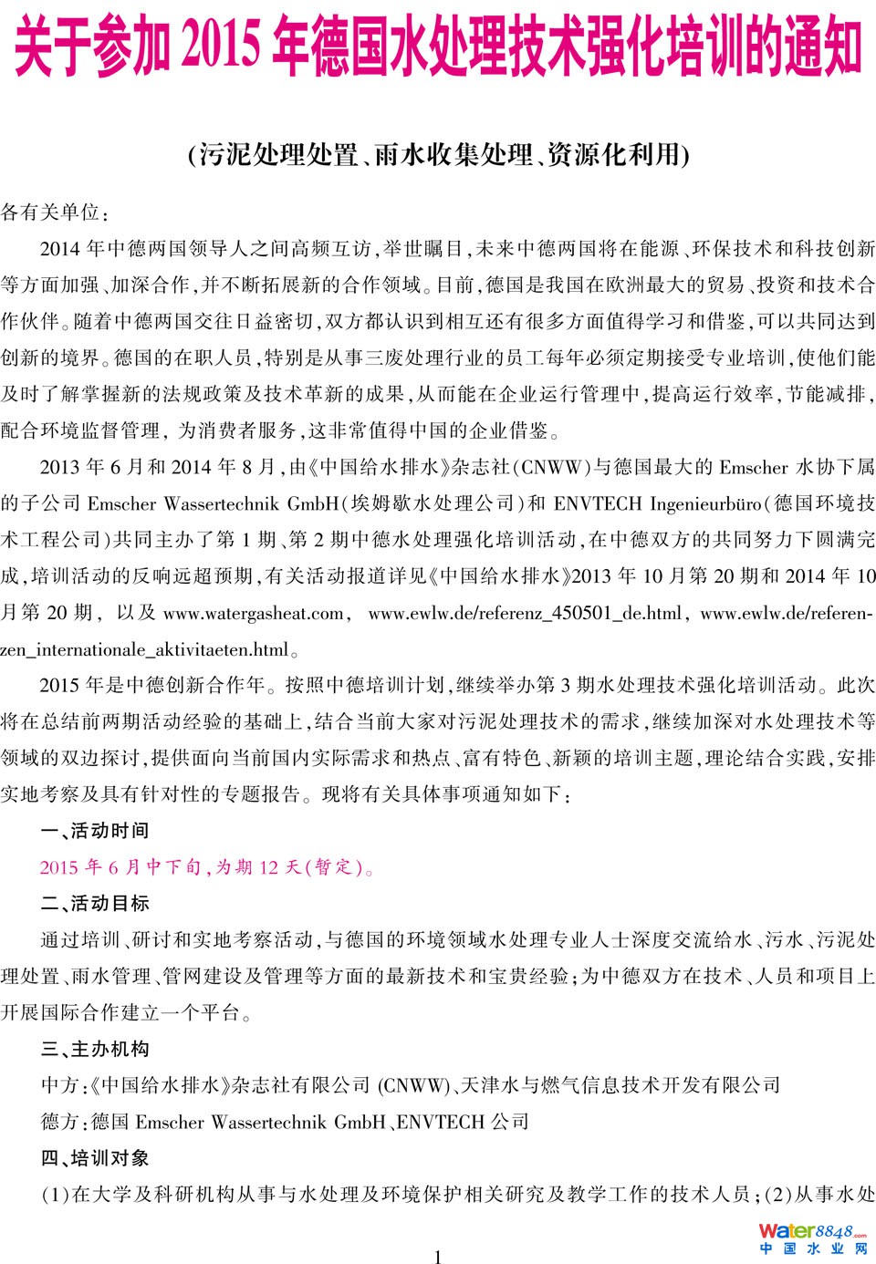 2015年是中德創(chuàng)新合作年。按照中德培訓(xùn)計(jì)劃,繼續(xù)舉辦第3期水處理技術(shù)強(qiáng)化培訓(xùn)活動(dòng)。此次將在總結(jié)前兩期活動(dòng)經(jīng)驗(yàn)的基礎(chǔ)上,結(jié)合當(dāng)前大家對(duì)污泥處理技術(shù)的需求,繼續(xù)加深對(duì)水處理技術(shù)等領(lǐng)域的雙邊探討,提供面向當(dāng)前國(guó)內(nèi)實(shí)際需求和熱點(diǎn)、富有特色、新穎的培訓(xùn)主題,理論結(jié)合實(shí)踐,安排實(shí)地考察及具有針對(duì)性的專題報(bào)告,F(xiàn)將有關(guān)具體事項(xiàng)通知如下:
