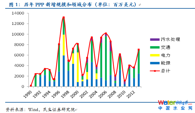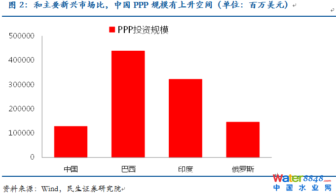 一、PPP模式在未來地方債扮演何種角色? 43號文提供了新一屆政府對地方債務(wù)治理的框架,其中明確將逐步剝離地方融資平臺公司的政府融資職能,推廣使用政府與社會資本合作模式。10月28日,財政部印發(fā)《地方政府存量債務(wù)納入預(yù)算管理清理甄別辦法》,最大亮點就是要大力推廣PPP模式,通過PPP模式將政府債務(wù)轉(zhuǎn)為企業(yè)債務(wù)。在融資政策的基礎(chǔ)上,財政部擬采取公司制PE形式設(shè)立中央財政PPP融資支持資金,為PPP項目開發(fā)、準(zhǔn)備階段和融資過程提供資金支持。 根據(jù)國務(wù)院研究發(fā)展中心的測算,到2020年,與城鎮(zhèn)化相關(guān)的融資需求約為42萬億元。根據(jù)43號文和《地方政府存量債務(wù)納入預(yù)算管理清理甄別辦法》的規(guī)定推演,未來地方政府性債務(wù)主要由一般政府債、專項政府債和PPP債構(gòu)成?梢姡瑧(yīng)對未來幾十年城鎮(zhèn)化的資金缺口,PPP模式被委以了重任。 從43號文規(guī)定來看,對于新增政府債務(wù),推廣使用政府與社會資本合作模式。鼓勵社會資本通過特許經(jīng)營等方式,參與城市基礎(chǔ)設(shè)施等有一定收益的公益性事業(yè)投資和運(yùn)營。對于存量政府債務(wù),在建工程確實沒有其他建設(shè)資金來源的,應(yīng)主要通過政府與社會資本合作模式和地方政府債券解決后續(xù)融資。 PPP模式具有較大的發(fā)展?jié)摿。一方面?013年中國PPP項目的累計總投資為1278億美元,和同類型新興市場比有較大的差距。另一方面,2013年新增的PPP投資額僅為7億美元,而2013年城投債的發(fā)行量則高達(dá)9512億元,若PPP模式成功替代城投主導(dǎo)的融資模式,其發(fā)展空間巨大。 資料圖