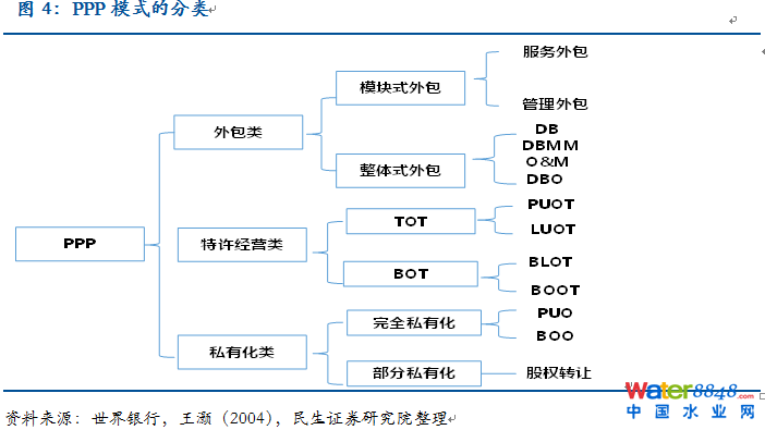 從廣義上來說,PPP指的是企業(yè)參與提供傳統(tǒng)上由政府獨自提供的公共產(chǎn)品或服務(wù)的模式。從世界銀行對PPP的分類來看,主要包括外包類、特許經(jīng)營類和私有化類。因此,BOT本質(zhì)上也可視為是PPP的一種。 資料圖