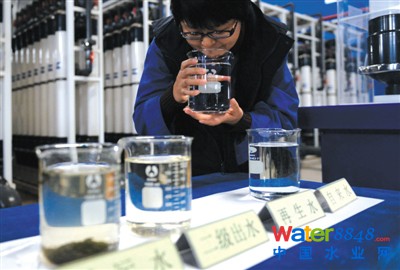 走進(jìn)清河再生水廠膜處理車間,展示臺(tái)上擺著四個(gè)燒杯,第一個(gè)里面的水是黑色的,第二個(gè)黃色,后兩個(gè)則是透明的。該廠副廠長(zhǎng)鮑海鵬介紹說:“第一個(gè)就是來自市政管道的污水,第二個(gè)是以前污水處理廠處理完了的,后面兩個(gè)一個(gè)是再生水,一個(gè)是自來水。它們兩個(gè)從感官上看區(qū)別很小。”