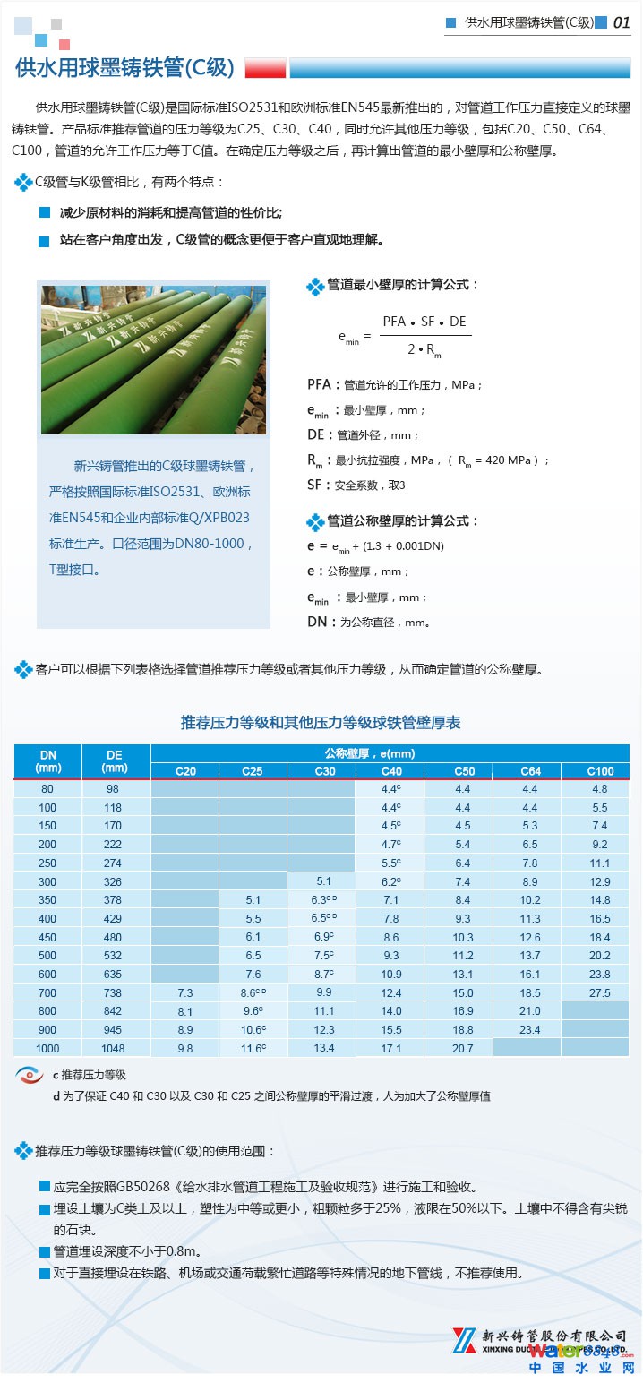 新興鑄管:產(chǎn)能180萬噸,口徑DN80~DN3000mm,有T型、K型、S型、N1型、自錨式等多種接口形式的球墨鑄鐵管適用于不同的地勢(shì)條件,采用水泥砂漿、聚氨酯、環(huán)氧陶瓷等防腐內(nèi)襯球墨鑄鐵管,滿足不同水質(zhì)輸送要求,以及鋅層+終飾防腐層、聚氨酯等外壁防腐處理技術(shù)的球墨鑄鐵管適用于不同的腐蝕性土壤環(huán)境條件,是城鎮(zhèn)供水、輸氣的理想管材。公司主持制定了《水及燃?xì)夤艿烙们蚰T鐵管、管件和附件》國(guó)家標(biāo)準(zhǔn)(GB/T13295-2008),生產(chǎn)規(guī)模和綜合技術(shù)實(shí)力居世界領(lǐng)先水平,國(guó)內(nèi)市場(chǎng)占有率達(dá)到45%,30%以上的產(chǎn)品出口到世界100多個(gè)國(guó)家和地區(qū)。