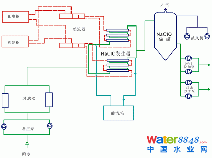 電解鹽水用次氯酸鈉發(fā)生系統(tǒng)及組成部分 ![]() 電解海水用次氯酸鈉發(fā)生系統(tǒng)及組成部分 ![]() 海水中含有大量的固體懸浮顆粒,會對次氯酸鈉發(fā)生器及其電解效率產(chǎn)生較大的影響。因此在海水被增壓泵抽入次氯酸鈉發(fā)生系統(tǒng)電解單元前,需經(jīng)過過濾器,將其中直徑大于0.5mm的顆粒除去。過濾后的海水通過電解單元,產(chǎn)生濃度為500~2000ppm的NaClO溶液,所產(chǎn)生的NaClO溶液隨即進入NaClO存儲箱。H2在存儲箱內(nèi)與NaClO溶液分離,通過鼓風機將H2稀釋到安全濃度下排入大氣。NaClO溶液通過連續(xù)投藥泵和沖擊投藥泵投加到需控制微生物的海水中。 |