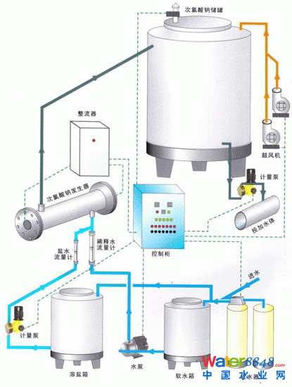 存貯及投加裝置:發(fā)生器產(chǎn)生的次氯酸鈉溶液輸送至次氯酸鈉儲罐存儲,鼓風機連續(xù)將儲罐內(nèi)氫氣稀釋,達到安全濃度排放。次氯酸鈉溶液按需由耐腐蝕泵投加至加藥點。 清洗裝置:耐腐蝕泵從酸箱中吸取酸溶液,定期對次氯酸鈉發(fā)生器電極進行清洗,保持設備正常運行。 自動控制裝置:系統(tǒng)所有裝置由控制柜集中準確控制,是系統(tǒng)安全、高效運行的指揮中心和控制中心。 |