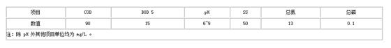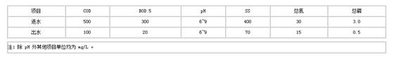 該廢水處理設(shè)施經(jīng)調(diào)試后穩(wěn)定運行一段時間,系統(tǒng)運轉(zhuǎn)情況良好,設(shè)備運轉(zhuǎn)正常。經(jīng)該系統(tǒng)處理后,廢水COD由500 mg/L降至90 mg/L以下,BOD5由300 mg/L降至20 mg/L以下,整體生化處理效率均達到82%以上,出水pH保持在7~8。表 2為該污水處理廠穩(wěn)定運行30 d時的出水水質(zhì)。