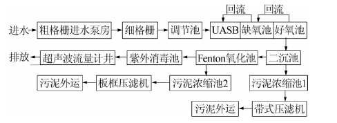 針對該工業(yè)園區(qū)廢水的特點,采用UASB+A/O+Fenton氧化工藝進行處理,經(jīng)工程實踐證明此工藝成熟,治理效果穩(wěn)定。其中深度處理Fenton池是保證該工藝出水COD穩(wěn)定<90 mg/L的關(guān)鍵。