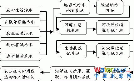 本工程總投資216萬(wàn)元,本著高效、低耗、投資省、運(yùn)行費(fèi)用低、操作與運(yùn)行管理便捷、充分利用當(dāng)?shù)刭Y源的原則。工程建成每天可處理污水量830m3 (其中含農(nóng)業(yè)面源排水、地下水滲漏及企業(yè)達(dá)標(biāo)排放尾水等),采用緩流納污河浜原位增氧-動(dòng)態(tài)生態(tài)組合工藝處理農(nóng)村生活污水技術(shù)(ODBP)方案治理陳巷浜流域,系統(tǒng)治理后的水質(zhì)COD、總氮、總磷消減率達(dá)50%以上,污水經(jīng)處理后排入漕橋河。