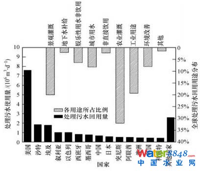 目前,再生水回用已被世界多國(guó)采納,作為解決城市水源問題的重要補(bǔ)充,其各類用途占比及其在全球各主要國(guó)家的回用量如圖6、7所示。