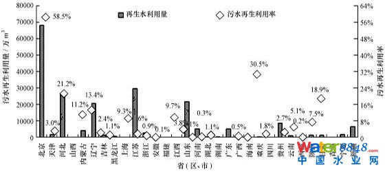 目前,中國(guó)多個(gè)省市已頒布再生水階梯水價(jià),利用自來水與再生水的價(jià)格差,刺激再生水利用。再生水利用納入市政給排水體系已成為大勢(shì)所趨。根據(jù)住建部2012年發(fā)布的統(tǒng)計(jì)數(shù)據(jù)(如圖8),全國(guó)污水回用率與再生水利用量較高的地區(qū)主要為人口密集的北方干旱地區(qū),如北京、河北、山東和遼寧等地。
