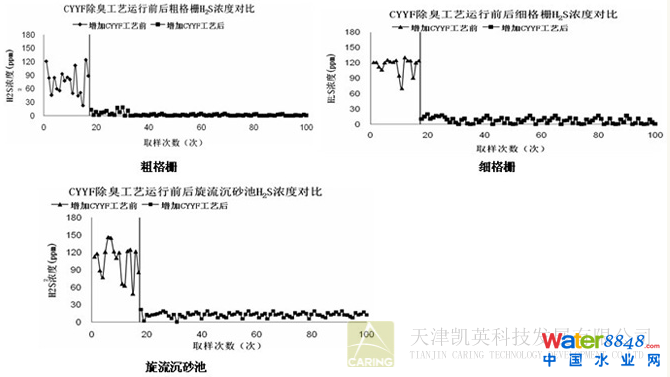 列舉增加CYYF工藝前后粗格柵、細(xì)格柵及旋流沉砂池H2S濃度對(duì)比圖。