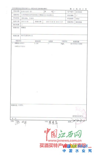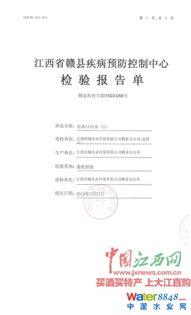 ![]() 贛縣污水處理水樣檢測報告 中國江西網(wǎng)訊 記者楊澤雷、李明水報道:4月1日,本網(wǎng)刊發(fā)新聞《村民投訴污水處理廠污染飲用水贛縣環(huán)保部門介入調(diào)查》,報道了贛州市章貢區(qū)七里鎮(zhèn)上坊自然村村民反映贛縣污水處理廠的污水未做處理直接排放到貢江,污染了村民的生活飲用水。4月3日,記者從贛縣環(huán)保局獲悉,相關(guān)檢測結(jié)果顯示,贛縣污水處理廠屬達(dá)標(biāo)排放,與村民飲用水檢測值超標(biāo)并無直接聯(lián)系。 4月3日,贛州市贛縣環(huán)保局環(huán)境監(jiān)察大隊(duì)一萬姓工作人員告訴記者,3月25日,贛州市環(huán)境監(jiān)察支隊(duì)、章貢區(qū)環(huán)境監(jiān)察大隊(duì)和贛縣環(huán)境監(jiān)察大隊(duì)聯(lián)合對贛縣污水處理廠污水池和總排口的水進(jìn)行取樣送檢,贛縣疾控中心已于日前出具檢測結(jié)果,兩份樣品硝酸鹽均符合相關(guān)標(biāo)準(zhǔn),村民飲用的井水檢測值超標(biāo)與贛縣污水處理廠污水處理并無直接聯(lián)系。
