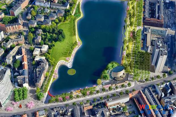 一張重新設(shè)計了湖濱后的效果圖,哥本哈根流中的水最終流入這樣的一個蓄水終端。