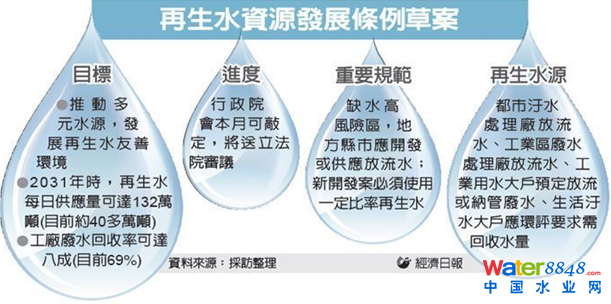 臺“行政院”本月可望敲定“再生水資源發(fā)展條例”草案,未來針對桃園、新竹、臺中、臺南與高雄等缺水高風險區(qū),將強制新投資案要使用一定比率再生水。