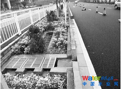 圖為海綿城市街邊植草溝。雨水通過護(hù)路磚的豁口流入植草溝下滲。溢流時(shí)可通過雨水收集口進(jìn)行收集。