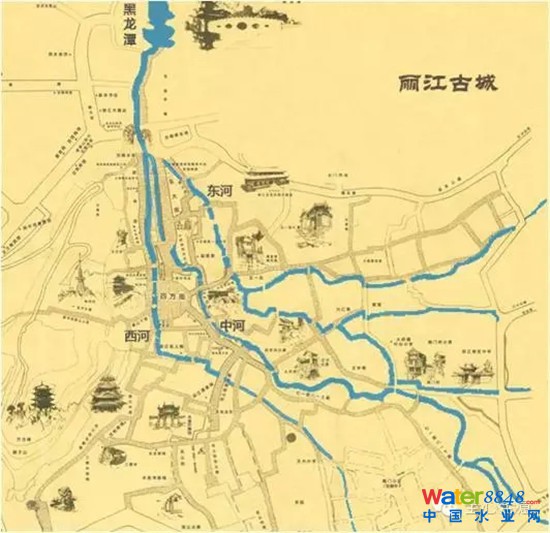 古城麗江對水體的保護和利用堪稱巧妙。麗江古城的水源來自于玉河水源頭——黑龍?zhí),麗江人將玉水河在玉龍橋下一分為三,形成東河、中河和西河三條水系。中河是古老的自然水系,自北而東南,穿過整個古城,把古城自然分為東、西兩城區(qū)。人工西河沿新華街入城,經(jīng)四方街、光義街,在木府的東、南、西三面環(huán)流,尤如護城河一般,再一分為二出城。人工東河沿新義街入城,在小石橋處再一分為二出城。麗江人建城并沒有阻塞住潺潺不絕的高山泉水,自然河道與人工河道的巧妙結(jié)合使麗江主街傍河、小巷臨渠,顯得無比清凈而又充滿生機。麗江人還利用城內(nèi)西河水的高低落差,按時提降閘門,使河水漫過街道清洗污垢,稱得上生態(tài)版“自動化環(huán)衛(wèi)系統(tǒng)”。