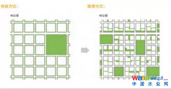 綠地等海綿體的兩種設(shè)計分布方式:傳統(tǒng)粗獷集中分布(左)和未來精細分散式分布(右)