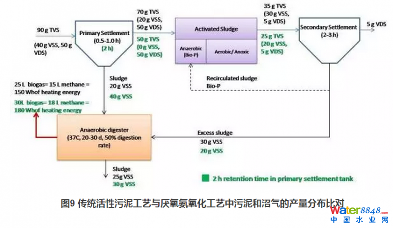 如果用厭氧氨氧化工藝替代傳統(tǒng)的硝化/反硝化工藝來脫氮,就不存在反硝化過程對有機物的最低需求,那么初沉污泥中有機物含量將會更多,也就會產(chǎn)生更多的沼氣。如果初沉階段加以絮凝工藝并適當(dāng)延長停留時間,基本上所有的懸浮固體在此階段都將被去除,儲存在初沉污泥中。這個過程在圖9中用綠色路線表示。工藝替代之后,將會有60g的VSS產(chǎn)生(其中40g來自初沉污泥,20g來自二沉污泥)并送往消化罐。在相同的消化率下,將會有30L沼氣產(chǎn)生,這些沼氣將產(chǎn)生180Wh的熱值;钚晕勰嚯A段需要被降解的有機物將從70g降至50g,也就意味著可以節(jié)省降解20%有機物所需要的曝氣耗電量。然而,消化污泥總量將從25g升至30g,意味著污泥處理的費用將會增加,當(dāng)然從能量回收利用的角度分析,如果可以將污泥回用至農(nóng)田利用,那么污泥處理費增加的問題也不再是什么缺陷。