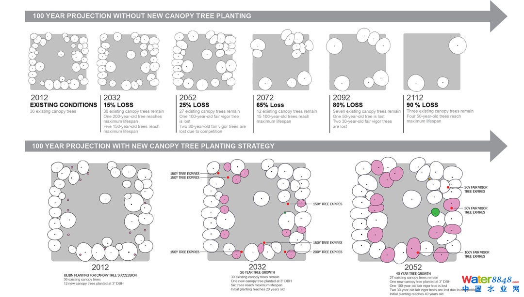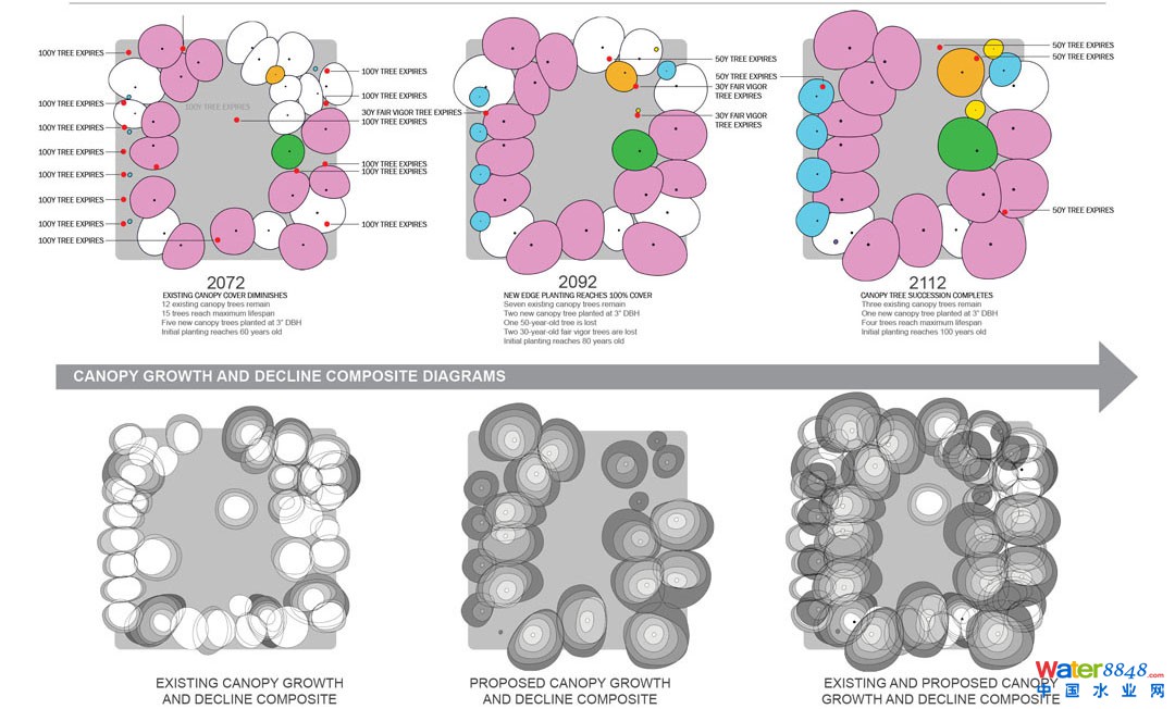 圖為100年內(nèi)樹木覆蓋的位置、大小和種類的預(yù)測。結(jié)果的重點在于改善空間、樹齡多樣性和增加樹木覆蓋面積。