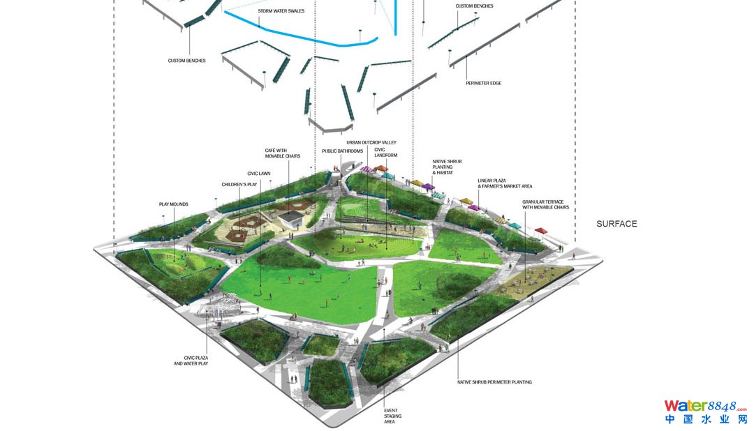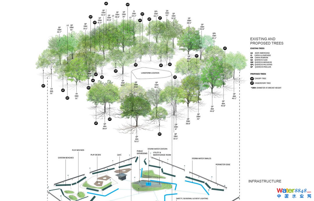 突起的地形起到地面公共設(shè)施核心的作用,可以把對根部系統(tǒng)的破壞降到最低,同時設(shè)有雨水蓄水池、盥洗室和雜