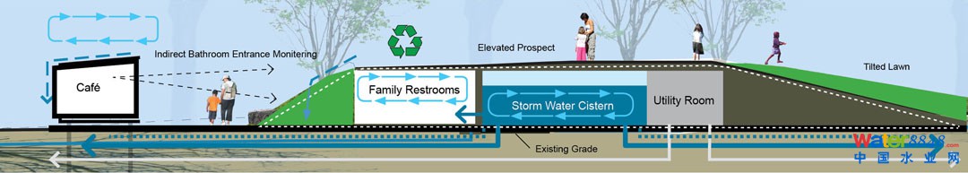 houses a storm water cistern, bathrooms, and utility room.
