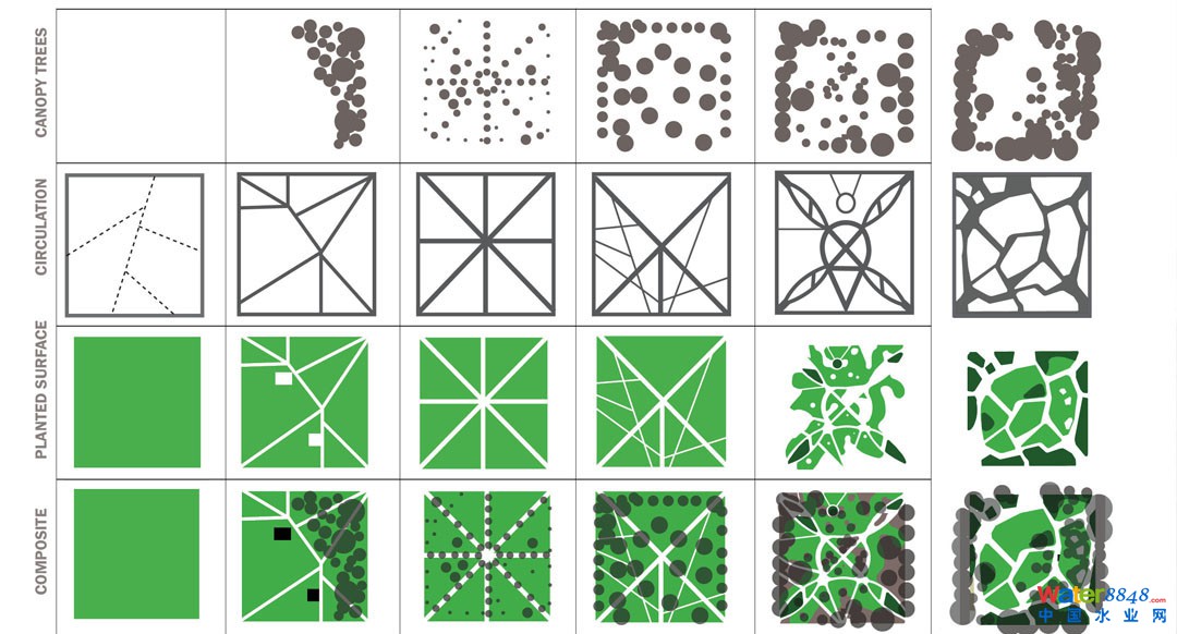 視覺上將廣場劃分出幾個特別的空間,滿足更多人群的要求。中心地形概念巧妙的打破了傳統(tǒng)的棋盤式道路結(jié)構(gòu),