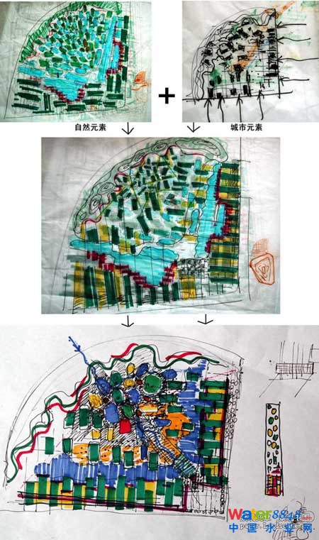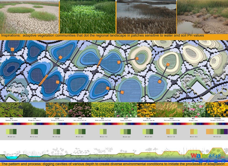 3 設(shè)計理念:讓自然工作。在不同的補丁有不同的水和土壤PH值,引發(fā)各自的生境適應(yīng)過程。靈感來自于場地中棲息地斑塊的PH值對水的敏感性。
