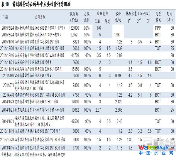 現(xiàn)有的業(yè)務(wù)線又雜又多,也沒啥好分析的,接下來幾年關(guān)鍵看水務(wù)。2014年公司及下屬公司持續(xù)通過BOT、TOT、收購兼并等方式開拓水務(wù)市場,目前公司的水務(wù)投資、工程項目分布于全國17個省、市、自治區(qū),共計49個城市,已基本形成了全國性布局,并已在湖南省、山東省等地實現(xiàn)了一定的地域優(yōu)勢,形成了規(guī)模效應(yīng),公司合計擁有約1600萬噸/日的水處理能力,服務(wù)人口超過3500萬人,位居國內(nèi)水務(wù)行業(yè)前列。與此同時,公司積極開拓固廢處理業(yè)務(wù),通過投資、收購等方式擴大在固廢處理行業(yè)的影響力,已在全國14個省市開展業(yè)務(wù),并已具有相當規(guī)模。