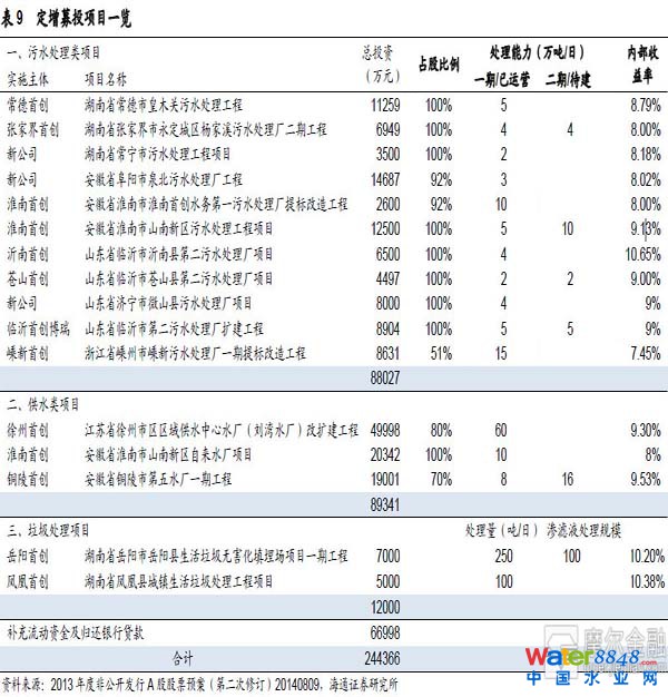 2013年8月發(fā)布非公開發(fā)行預(yù)案,14年末已核準,以15個市政項目與補充流動性資金為募投方向,募集資金20.54億元。預(yù)案中涉及10個污水處理項目,處理能力合計59萬噸/日、3個供水項目,處理能力合計79萬噸/日和2個生活垃圾處理項目,處理能力合計350噸/日。(Ps下圖有錯,淮南首創(chuàng)1.25億的項目在第二次修訂中取消了,補充流動資金改成6.1億)