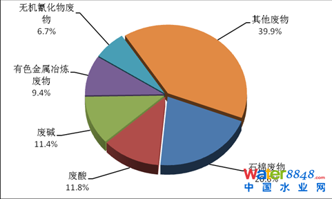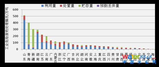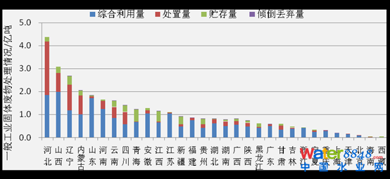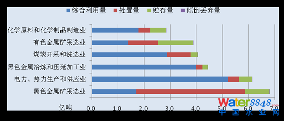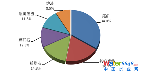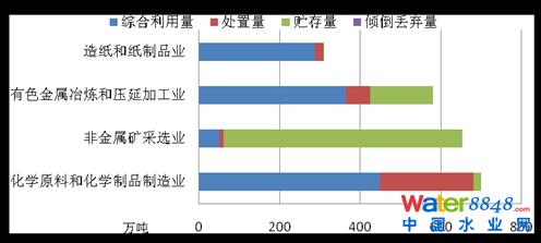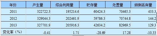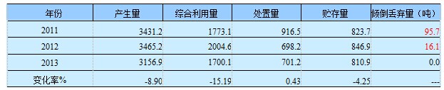 4.1 一般工業(yè)固體廢物產(chǎn)生及處理情況 2013年,全國(guó)一般工業(yè)固體廢物產(chǎn)生量32.8億噸,比上年減少0.41%,綜合利用量為20.6億噸,比上年增加1.71%,綜合利用率為62.2%,貯存量為4.3億噸,比上年減少28.7%;處置量為8.3億噸,比上年增加17.3%;傾倒丟棄量為129.3萬(wàn)噸,比上年減少10.3%。 表4-1 全國(guó)一般工業(yè)固體廢物產(chǎn)生及處理情況 單位:萬(wàn)噸 注:1.“綜合利用量”包括綜合利用往年貯存量,“處置量”包括處置往年貯存量; 2.工業(yè)固體廢物綜合利用率=工業(yè)固體廢物綜合利用量/(工業(yè)固體廢物產(chǎn)生量+綜合利用往年貯存量)。 重點(diǎn)調(diào)查工業(yè)企業(yè)的一般工業(yè)固體廢物產(chǎn)生量為31.3億噸。其中,尾礦產(chǎn)生量為10.6億噸,占34.0%,尾礦綜合利用量為3.3億噸,綜合利用率為30.7%;粉煤灰產(chǎn)生量4.6億噸,占14.8%,綜合利用量為4.0億噸,綜合利用率為86.2%;煤矸石產(chǎn)生量3.8億噸,占12.3%,綜合利用量為2.8億噸,綜合利用率為71.1%;冶煉廢渣產(chǎn)生量3.7億噸,占11.8%,綜合利用量為3.4億噸,綜合利用率為91.8%;爐渣產(chǎn)生量2.6億噸,占8.5%,綜合利用量為2.4億噸,綜合利用率為89.9%。 圖4-1 一般工業(yè)固體廢物構(gòu)成 尾礦產(chǎn)生量較大的省份依次為河北2.4億噸、遼寧1.1億噸、四川0.8億噸、江西0.7億噸、云南0.6億噸。其中河北、遼寧兩省尾礦產(chǎn)生量占全國(guó)的33.3%。 粉煤灰產(chǎn)生量較大的省份依次為山西4192.4萬(wàn)噸、山東4159.6萬(wàn)噸、內(nèi)蒙古4082.6萬(wàn)噸、河南3670.3萬(wàn)噸和江蘇3048.8萬(wàn)噸,這5個(gè)省粉煤灰產(chǎn)生量占全國(guó)的41.4%。 煤矸石產(chǎn)生量較大的省份依次為山西1.4億噸、內(nèi)蒙古0.5億噸、安徽0.3億噸、河南0.3億噸和山東0.2億噸。其中,山西省煤矸石產(chǎn)生量占全國(guó)的35.2%。 冶煉廢渣產(chǎn)生量較大的省份依次為河北7394.4萬(wàn)噸、遼寧3417.4萬(wàn)噸、山東3047.1萬(wàn)噸、江蘇2875.3萬(wàn)噸和山西1969.6萬(wàn)噸,5省冶煉廢渣產(chǎn)生量占全國(guó)的50.8%。其中河北省冶煉廢渣產(chǎn)生量占20.1%。 4.1.1各地區(qū)一般工業(yè)固體廢物產(chǎn)生及處理情況 2013年,一般工業(yè)固體廢物產(chǎn)生量較大的省份為河北4.3億噸,占全國(guó)工業(yè)企業(yè)產(chǎn)生量的13.2%;山西3.1億噸,占全國(guó)工業(yè)企業(yè)產(chǎn)生量的9.3%;遼寧2.7億噸,占全國(guó)工業(yè)企業(yè)產(chǎn)生量的8.2%;內(nèi)蒙古2.0億噸,占全國(guó)工業(yè)企業(yè)產(chǎn)生量的6.1%;山東1.8億噸,占全國(guó)工業(yè)企業(yè)產(chǎn)生量的5.5%。 圖4-2 各地區(qū)一般工業(yè)固體廢物綜合利用、處置、貯存、傾倒丟棄情況 綜合利用量超過(guò)1億噸的省份有7個(gè)省,較大的省份為山西2.0億噸,主要為煤矸石,占全省工業(yè)企業(yè)綜合利用量的44.7%;河北1.8億噸,主要為冶煉廢渣,占全省工業(yè)企業(yè)的40.1%;山東1.7億噸,主要為粉煤灰、冶煉廢渣和尾礦,占全省工業(yè)企業(yè)的55.5%;遼寧1.2億噸,主要為尾礦、冶煉廢渣和粉煤灰,占全省工業(yè)企業(yè)的53.2%;河南1.2億噸,主要為粉煤灰和煤矸石,占全省工業(yè)企業(yè)的51.1%;江蘇1.1億噸,主要為冶煉廢渣、粉煤灰和爐渣,占全省工業(yè)企業(yè)的75.7%;安徽1.0億噸,主要為煤矸石、粉煤灰和尾礦,占全省工業(yè)企業(yè)的61.8%。這7個(gè)省份的一般工業(yè)固體廢物綜合利用量占全國(guó)工業(yè)企業(yè)的48.8%。一般工業(yè)固體廢物綜合利用率較大的省份為天津、上海、江蘇、浙江和山東,均高于90%。 處置量較大的省份為河北2.3億噸,主要為尾礦,占全省工業(yè)企業(yè)的89.8%;遼寧1.1億噸,主要為尾礦,占全省工業(yè)企業(yè)處置量的45.4%;內(nèi)蒙古0.8億噸,主要為尾礦和煤矸石,占全省工業(yè)企業(yè)的82.5%;山西0.8億噸,主要為煤矸石,占全省工業(yè)企業(yè)的53.7%;四川0.5億噸,主要為尾礦,占全省工業(yè)企業(yè)的87.6%。這5個(gè)省份的一般工業(yè)固體廢物處置量占全國(guó)工業(yè)企業(yè)的68.1%。 貯存量較大的省份為青海0.6億噸,主要為尾礦和其它廢物,占全省工業(yè)企業(yè)的98.0%;江西0.5億噸,主要為尾礦,占全省工業(yè)企業(yè)的92.0%;遼寧0.4億噸,主要為尾礦,占全省工業(yè)企業(yè)的87.2%;新疆0.4億噸,主要為尾礦,占全省工業(yè)企業(yè)貯存量的59.0%;四川0.3億噸,主要為尾礦,占全省工業(yè)企業(yè)的81.0%。這5個(gè)省份的一般工業(yè)固體廢物貯存量占全國(guó)工業(yè)企業(yè)的49.0%。 傾倒丟棄量較大的省份為云南48.9萬(wàn)噸,主要為尾礦,占全省一般工業(yè)固體廢物傾倒丟棄量的66.2%;新疆26.5萬(wàn)噸,主要為尾礦,占全省工業(yè)企業(yè)的78.2%;貴州19.2萬(wàn)噸,主要為其它廢物,占全省工業(yè)企業(yè)的61.8%;重慶11.5萬(wàn)噸,主要為煤矸石,占全省工業(yè)企業(yè)的77.0%;遼寧9.1萬(wàn)噸,主要為其它廢物,占全省工業(yè)企業(yè)的98.7%。這5個(gè)省份的工業(yè)固體廢物傾倒丟棄量占全國(guó)工業(yè)企業(yè)的89.0%。 4.1.2 工業(yè)行業(yè)固體廢物產(chǎn)生及處理情況 2013年,一般工業(yè)固體廢物產(chǎn)生量較大的行業(yè)依次為黑色金屬礦采選業(yè)6.8億噸,占重點(diǎn)調(diào)查工業(yè)企業(yè)的21.7%;電力、熱力生產(chǎn)和供應(yīng)業(yè)6.1億噸,占重點(diǎn)調(diào)查工業(yè)企業(yè)的19.4%;黑色金屬冶煉