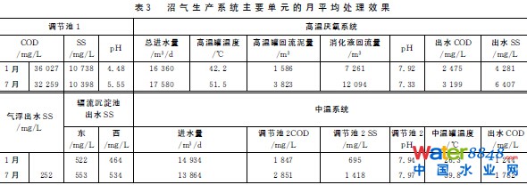 根據(jù)上游酒精生產(chǎn)廢水的進(jìn)水量和COD濃度以及商品沼氣的需求量,廠內(nèi)目前啟用了16座高溫罐和10座中溫UASB反應(yīng)器。據(jù)2013年冬季1月和夏季7月的生產(chǎn)日報(bào)表,沼氣生產(chǎn)系統(tǒng)主要單元的月平均處理數(shù)據(jù)見表3。分析表3可知,高溫罐實(shí)際進(jìn)水COD負(fù)荷在3~4kgCOD/(m3·d),平均為3.6kgCOD/(m3·d),COD去除率達(dá)90%,SS去除率接近40%。因高溫罐是逐對啟動(dòng),輪流排除剩余污泥,故其中8對高溫罐內(nèi)的污泥濃度為10~115g/L不等。在罐體底部已形成顆粒污泥的,可排出并作為商品外售。污泥外回流比平均為22%,在0~50%的設(shè)計(jì)范圍之內(nèi)。