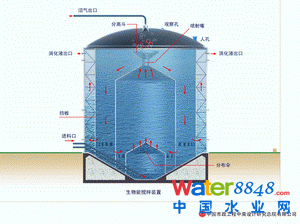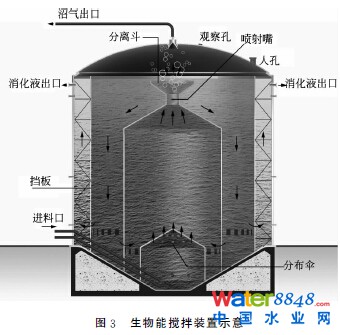 生物能攪拌裝置由分布傘、觀察孔、人孔、噴射嘴、分離斗、擋板等部分組成。該裝置中物料在微生物菌體的作用下,迅速產(chǎn)生沼氣,沼氣在裝置內(nèi)以鼓泡形式自下而上運(yùn)動(dòng);氣流上升過程中挾帶物料、菌膠團(tuán)、固體顆粒,呈現(xiàn)出氣液混合流動(dòng)相;混合流漸進(jìn)噴射嘴時(shí),流速加快,聚集在噴嘴出口處以一定的速度沖出,流體形成翻卷和渦流。另一方面由于裝置內(nèi)氣體和液體的溢出,空出的容積則被下方容器底部周圍的液體涌入而得以補(bǔ)充;由此周而復(fù)始形成環(huán)流造成大的擾動(dòng),達(dá)到物料、溫度、酸度的均布,微生物與物料的充分混合接觸,加快消化速度,提高物料的轉(zhuǎn)化率和設(shè)備利用率。