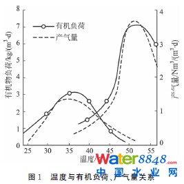 高溫厭氧消化對COD的去除率通常比中溫時(shí)高25%~50%,常溫厭氧消化的COD去除率約為中溫消化的10%~20%。厭氧消化時(shí),溫度與有機(jī)負(fù)荷、產(chǎn)氣量關(guān)系如圖1所示。
