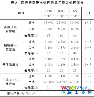 兩級厭氧段廢水處理各單元預(yù)計(jì)處理效果見表2。