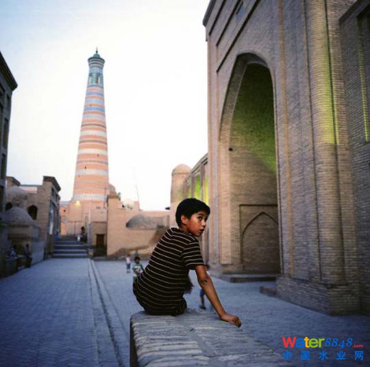 從布哈拉往西到達另一個綠洲古城希瓦需要在沙漠穿行470公里。從某種意義上說,希瓦比布哈拉更幸運。這座城市的一切都是水賦予的。傳說,上古大洪水之后,諾亞的兒子閃(Shem)和同伴們在沙漠迷了路,又饑又渴時發(fā)現(xiàn)一眼清泉,便在清泉邊興建了希瓦城。