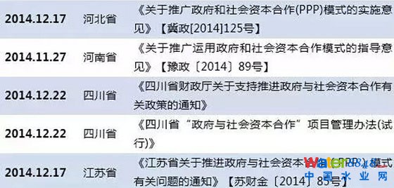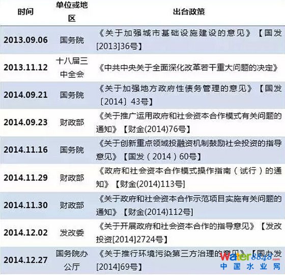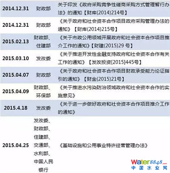 此外,值得一提的還有2014年12月27日國(guó)務(wù)院辦公廳推出的《關(guān)于推行環(huán)境污染第三方治理的意見(jiàn)》和2015年2與13日財(cái)政部聯(lián)合住建部發(fā)布的《關(guān)于市政公用領(lǐng)域開(kāi)展政府和社會(huì)資本合作項(xiàng)目推介工作的通知》,兩個(gè)文件特別針對(duì)市政公用領(lǐng)域(含環(huán)保領(lǐng)域)PPP項(xiàng)目提出了具體的實(shí)質(zhì)性指導(dǎo)意見(jiàn)。